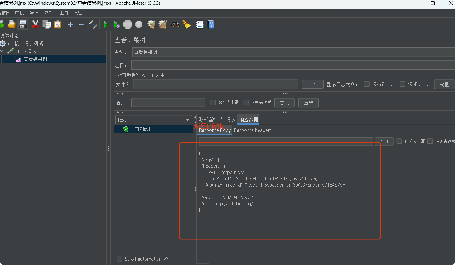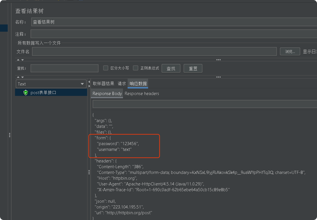 3. 添加“察看结果树”,运行后查看响应体中form字段是否包含提交的参数。