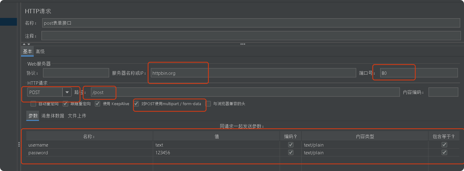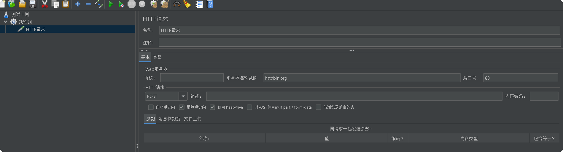 1. 新建线程组(配置同上),添加“HTTP请求”,服务器httpbin.org,端口80,方法POST,路径/post