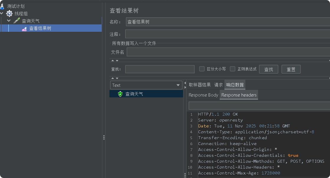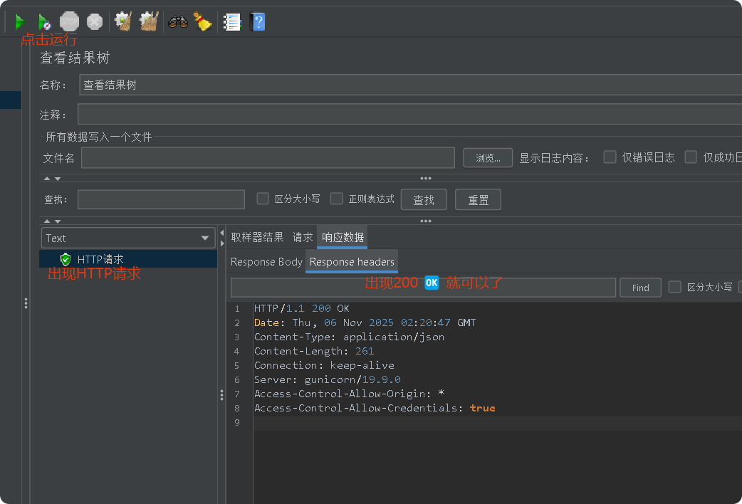 3. 添加“察看结果树”监听器,点击运行,验证响应状态码200及返回数据是否包含请求参数。