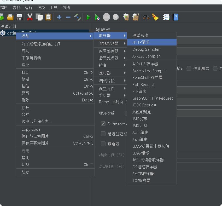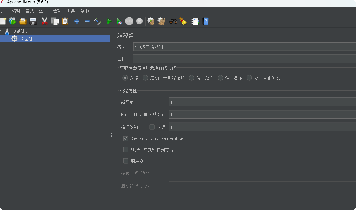 1. 打开JMeter,新建测试计划,右键添加“线程组”(线程数1、循环次数1)。