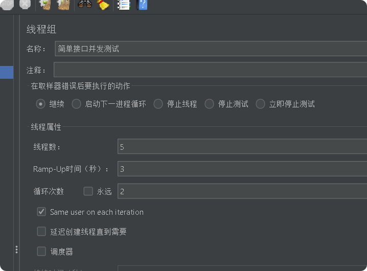 1. 新建线程组,设置线程数5、循环次数2、 ramp-up时间3秒(每秒启动约2个线程)。