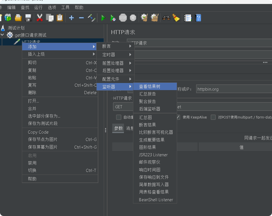2. 线程组下添加“HTTP请求”,服务器名称/IP填写httpbin.org,端口80,请求方法选GET,路径填写/get。
