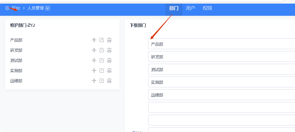 2.添加部门:产品部、研发部、测试部、实施部、运维部