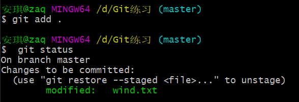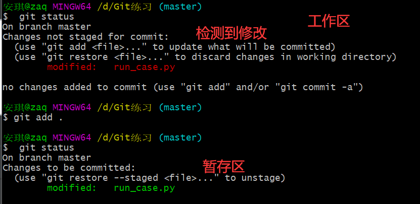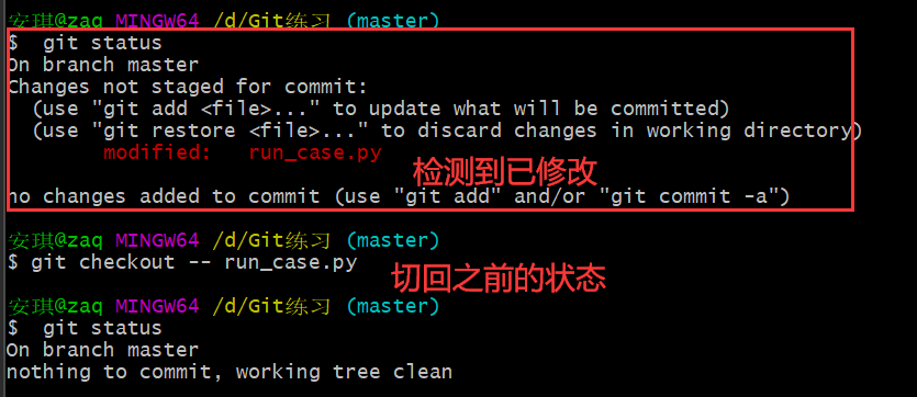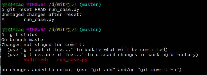 回到了未暂存的状态,但还是已修改的内容,就是 内容改了 工作区切回来了