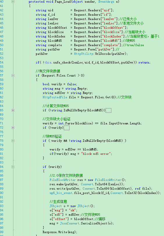 up6自带续传功能,up6在服务端已经保存了文件的信息,在客户端也保存了文件的进度信息。在上传时控件会自动加载文件进度信息,开发者不需要关心这些细节。在文件块的处理逻辑中只需要根据文件块索引来识别即可。
