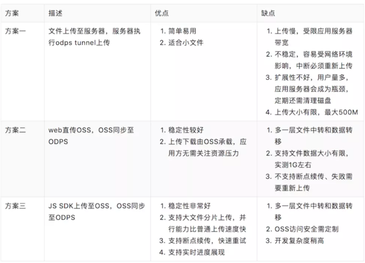 文件上传至ODPS基本思路是先文件上传至某中转区域存储,然后同步至ODPS,根据存储介质可以分为两类,一类是应用服务器磁盘,另一类类是中间介质,OSS作为阿里云推荐的海量、安全低成本云存储服务,并且有丰富的API支持,成为中间介质的首选。而文件上传至OSS又分为web直传和sdk上传两种方案,因此上传方案有如下三种,详细优缺点对比如下: