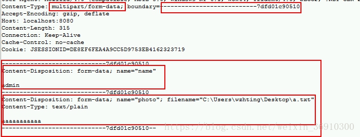 大致实现原理:当enctype的值是multipart/form-data时,浏览器会把每个表单项进行分割,分割成不同的部件,以boundary的值为分割标识,这个标识的字符串是随机生成的,最后一个表单项的分割标识字符串末尾会多两个”- -“,代表结束。服务端用request.getHeader(“content-type”)获取分割字符串,然后进行解析。