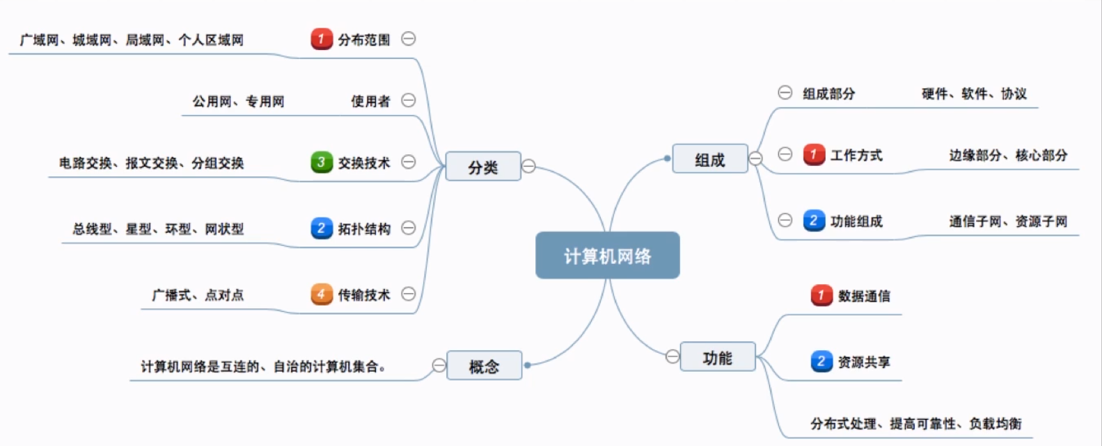 - 按分布范围:广域网WAN(使用交换技术)、城域网MAN、局域网WAN(使用广播技术)、个人区域网PAN
