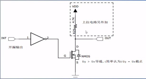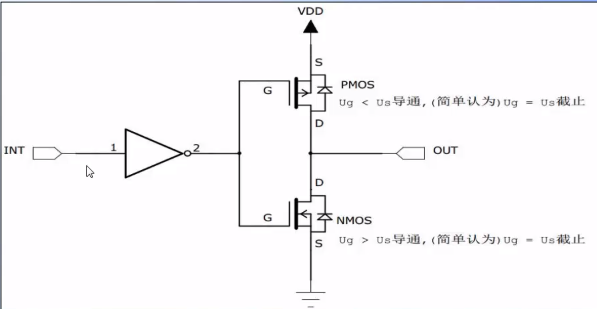 但INT=1时,NMOS截止,OUT既不输出高电平也不输出低电平,处于高阻态。