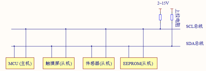 - 总线通过上拉电阻接到电源。当设备空闲时,会输出高阻态,而当所有设备都空闲,都输出高阻态时,由上拉电阻把总线拉成高电平。
