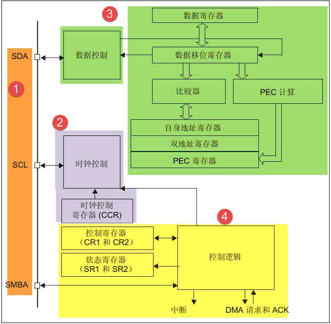 STM32的I2C外设可用作通讯的主机及从机,支持100Kbit/s和400Kbit/s的速率,支持7位、10位设备地址,支持DMA数据传输, 并具有数据校验功能。