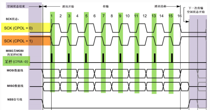 时钟极性CPOL是指SPI通讯设备处于空闲状态时,SCK信号线的电平信号(即SPI通讯开始前、 NSS线为高电平时SCK的状态)。CPOL=0时, SCK在空闲状态时为低电平,CPOL=1时,则相反。