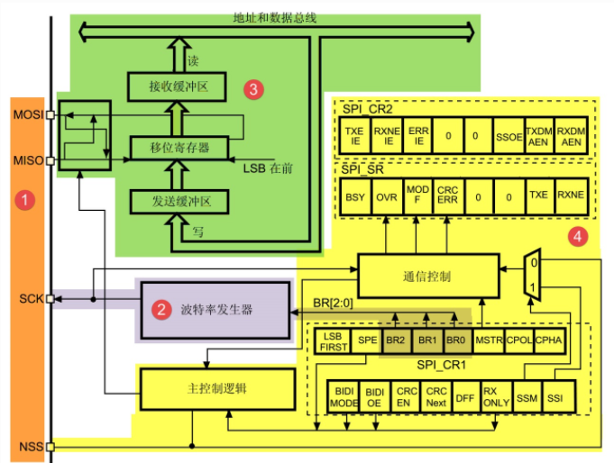 整体控制逻辑负责协调整个SPI外设,控制逻辑的工作模式根据我们配置的“控制寄存器(CR1/CR2)”的参数而改变,基本的控制参数包括前面提到的SPI模式、 波特率、LSB先行、主从模式、单双向模式等等。在外设工作时,控制逻辑会根据外设的工作状态修改“状态寄存器(SR)”,我们只要读取状态寄存器相关的寄存器位, 就可以了解SPI的工作状态了。除此之外,控制逻辑还根据要求,负责控制产生SPI中断信号、DMA请求及控制NSS信号线。