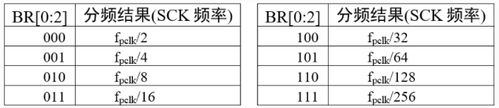 SCK线的时钟信号,由波特率发生器根据“控制寄存器CR1”中的BR[0:2]位控制,该位是对fpclk时钟的分频因子, 对fpclk的分频结果就是SCK引脚的输出时钟频率。