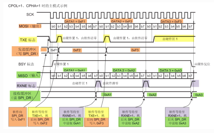 通讯开始,SCK时钟开始运行。MOSI把发送缓冲区中的数据一位一位地传输出去; MISO则把数据一位一位地存储进接收缓冲区中;