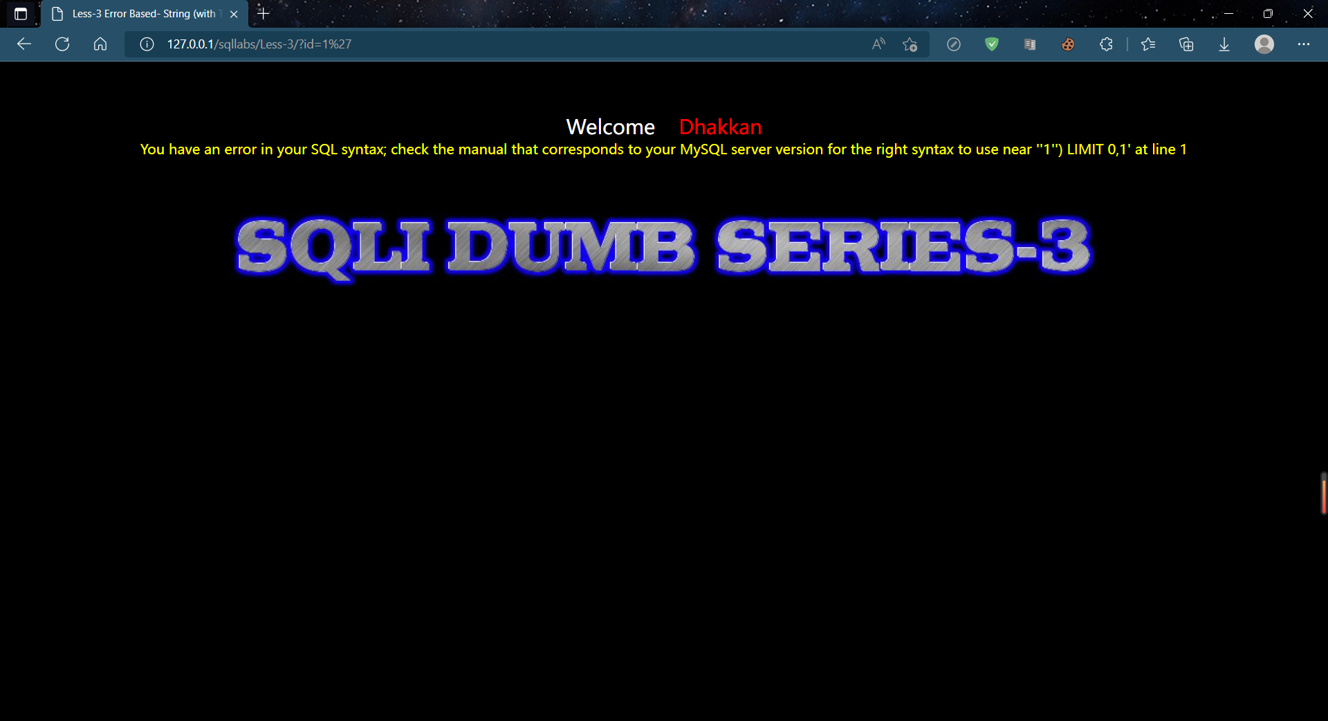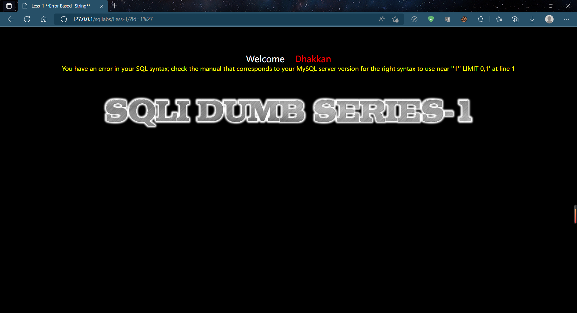 而输入 ?id= 1' 后出现报错near ' '1'' LIMIT 0,1' at line 1 (黄色为用于表示错误内容的单引号可以忽略,红色字符为输入的内容),表明了是字符型注入