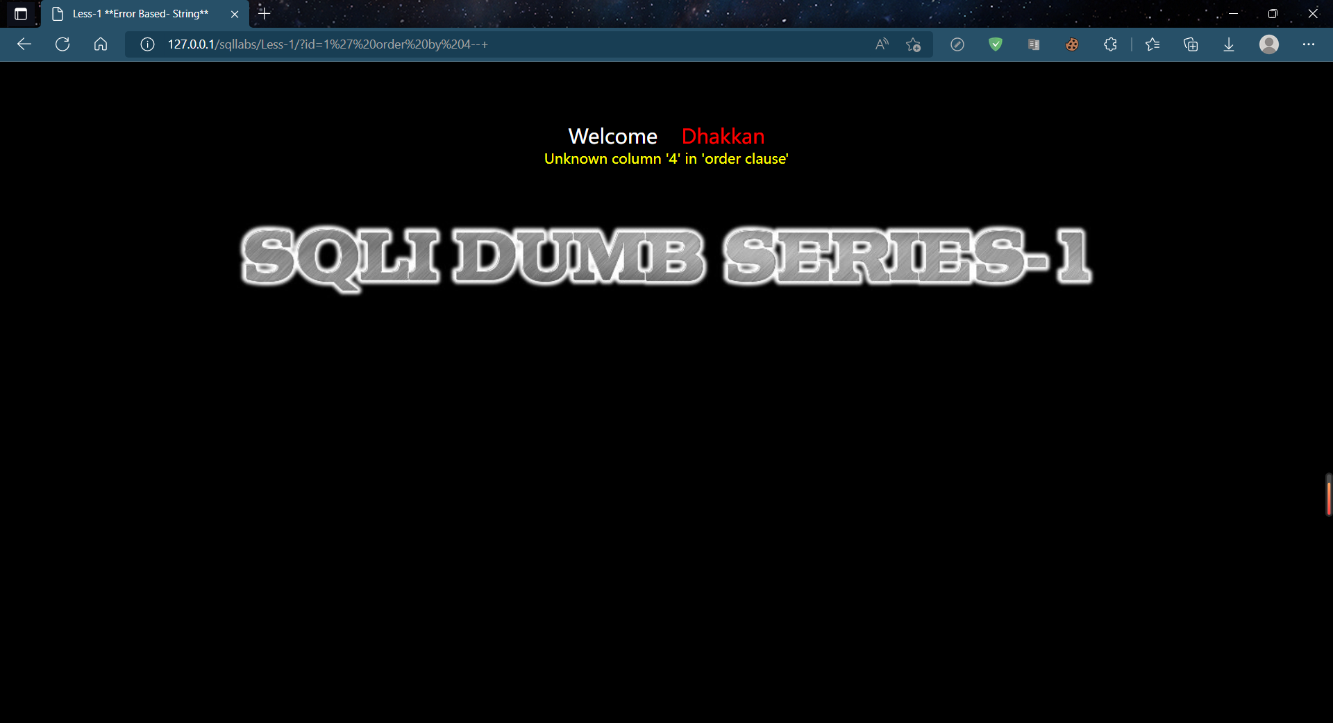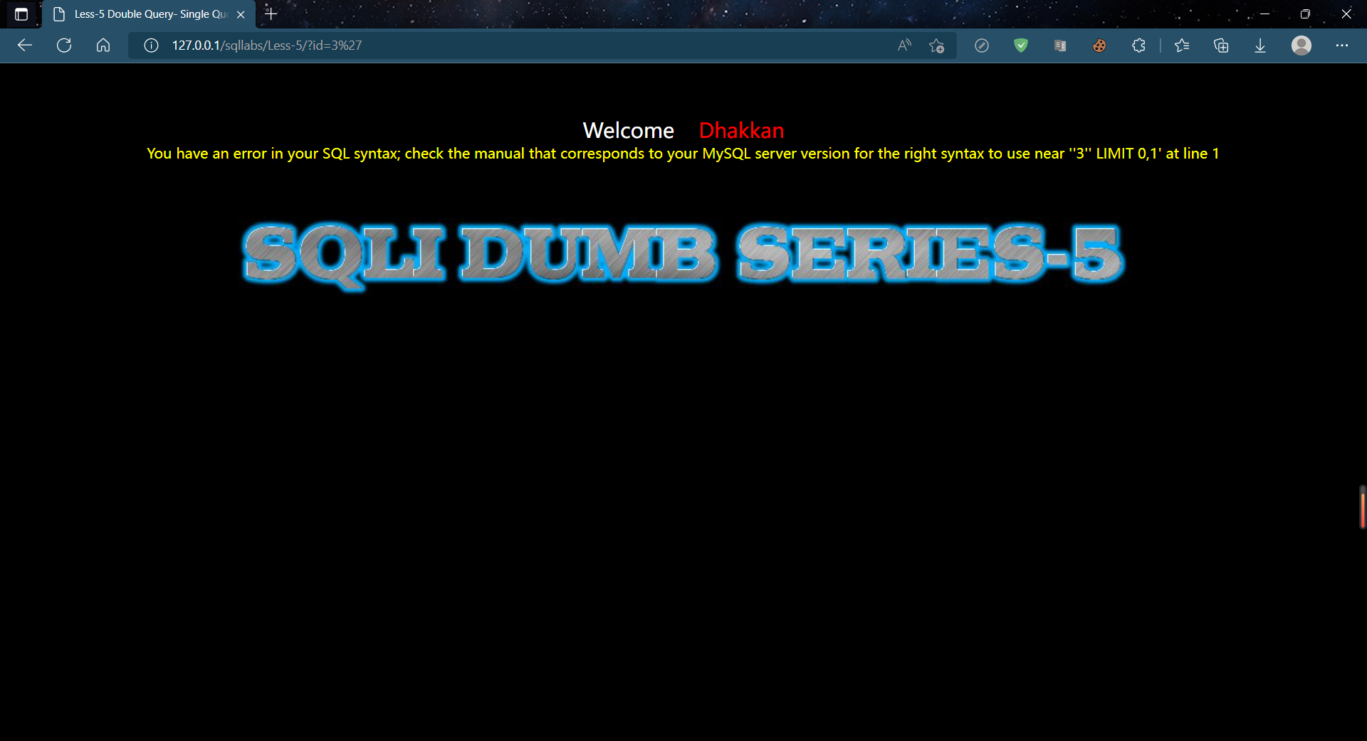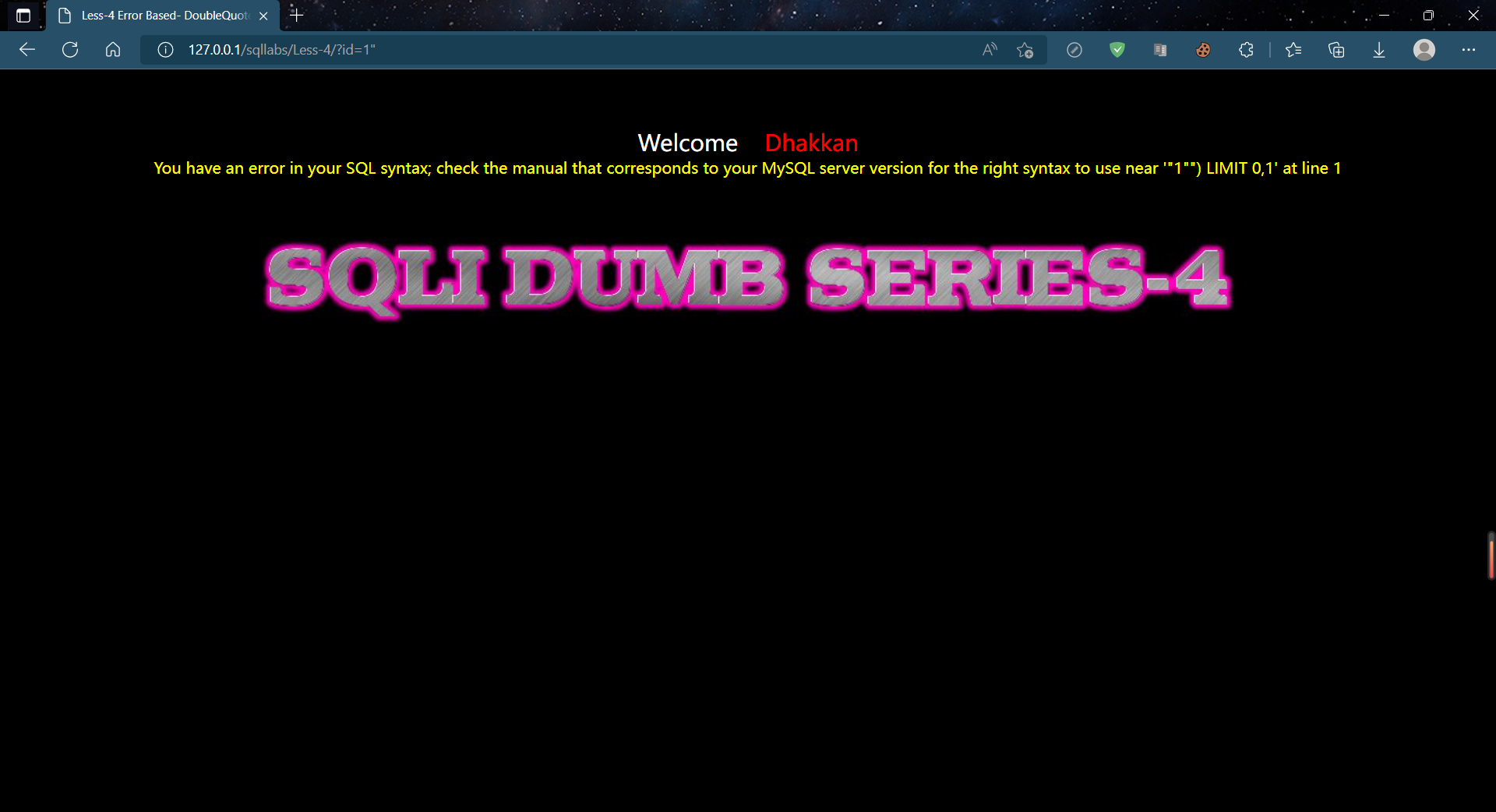 near ' "1" ")根据报错信息 和第三题的构造方式类似,只是把单引号(’)换为 双引号(“). 得到payload 为 id= -1") union sql_command 此后的内容与第一题相同。