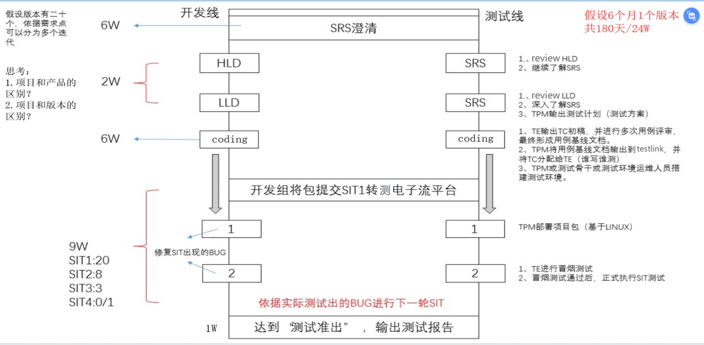 产品开需求会议=测试和开发拿到需求=分析需求=编写测试计划(测试经理)=编写测试用例=评审用例,评审通过=将用例导入用例管理工具=搭建环境=开发提测,达到准入要求=部署项目包到环境中=开始冒烟测试=sit1系统集成测试=有bug提交给开发=开发修改好=提交第二次代码包=部署项目包到环境中=在冒烟测试=sit2测试=以此类推=直到达到准出要求0bug,用例100%执行=输出测试报告=通知uat测试=uat验收通过=封装版本=等待上线=准备线上数据=上线=线上测试=测试无bug表示上线成功。