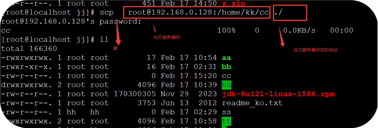 (2)拿文件:scp root@对方IP地址:路径 本服务器目录(路径)