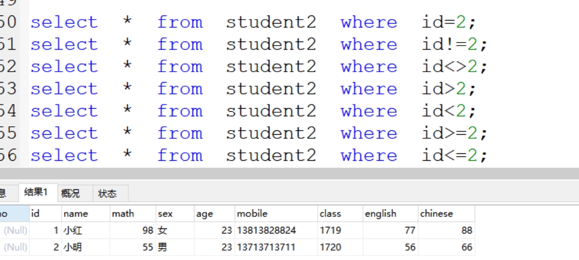 案例:select * from student2 where id BETWEEN 2 and 5;