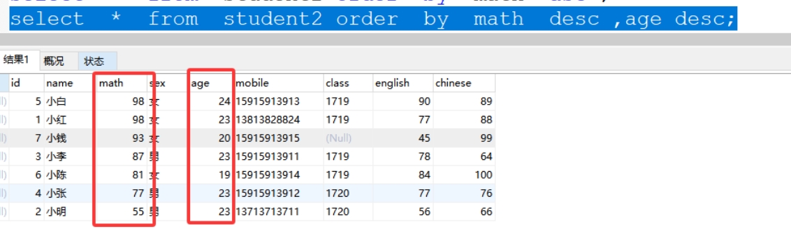 select * from student2 order by 字段1 desc ,字段2 desc;