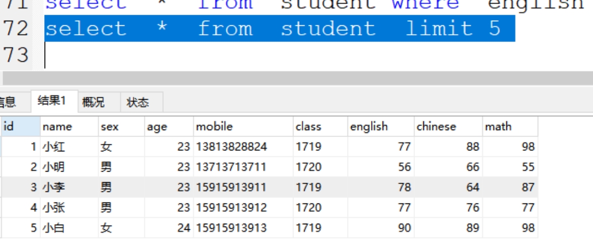 3)查找8结尾的数据:select * from student2 where math like "%8";