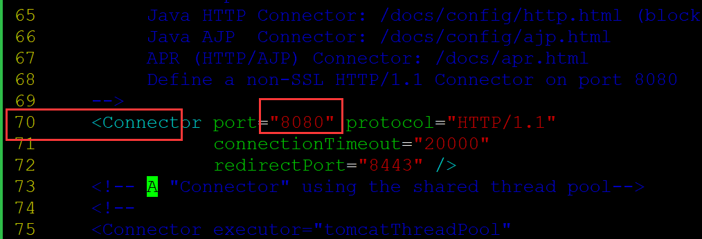 (2)tomcat 端口 在conf 中server .xml 文件中找到conner开头的代码,修改端口号 (69号)
