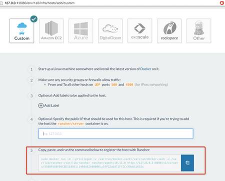 首先创建一个host主机。测试就把本机当成一个主机吧。一定要执行那个命令,执行完成之后就把本机当成一个客户端了。其实下载的rancher/agent ,并且把客户端注册上。