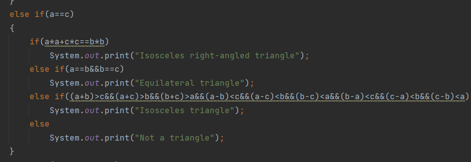else if((a+b)>c&&(a+c)>b&&(b+c)>a&&(a-b)<c&&(a-c)<b&&(b-c)<a&&(b-a)<c&&(c-a)<b&&(c-b)<a)
