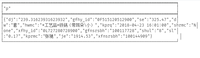 "(p:FP{dj: '3202.7586206896553', dw:'把',gfhy_id:'0F515150515400',gfnsrsbh:'100136633',hwmc:'*医疗仪器器械*DE\\'BAKEY 无损伤血管钳 90度 ,45/93MM,225MM',je:'3202.76',kprmc:'倪茹',kprq:'2018-07-10 11:38:44',se:'512.44',shrmc:'None',shul:'1',sl:'0.16',xfhy_id:'0F515150515400',xfnsrsbh:'100178692'})"