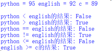print("english >= c的结果: " + str(python >= c)) # 大于或等于操作