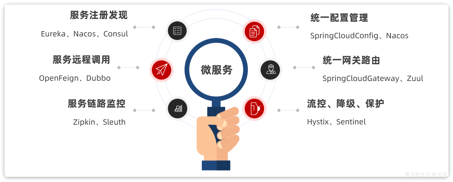 每个微服务是一个SpringBoot工程,微服务之间的通信协作、服务保护等各种问题都有对应的解决方案和微服务组件,SpringCloud框架可以说是目前Java领域最全面的微服务组件的集合了,如下图: