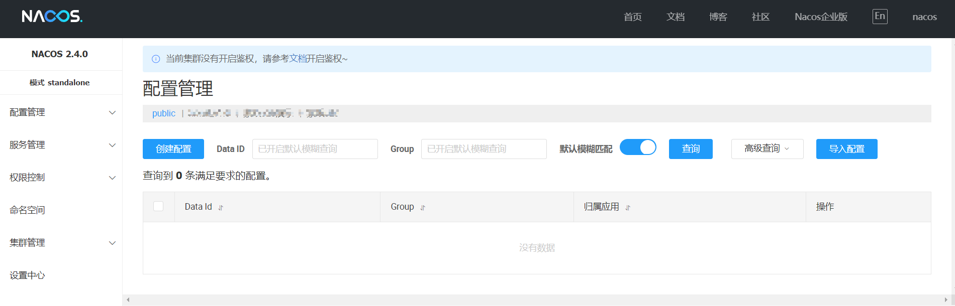 注意:2.4版本开始nacos默认不进行认证直接进入首页,以前的版本首次访问会跳转到登录页,账号密码都是nacos