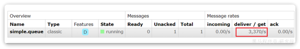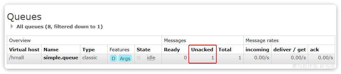 - 由于该队列并没有消费程序去监听,当到达30分钟时该消息变为死信,自动发给死信交换机“hmall.direct”,由列信交换机将消息转发到"direct.queue1"队列。