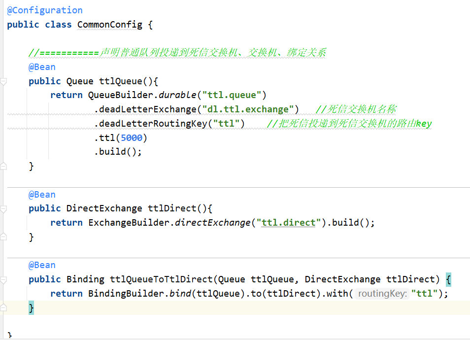 说明:一般这里的routingKey都是相同的ttl,当发送消息的时候和绑定死信交换机的时候,同时都设置了队列时间,那么这里以最短的设置时间为准。