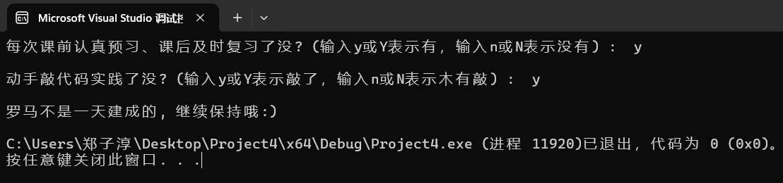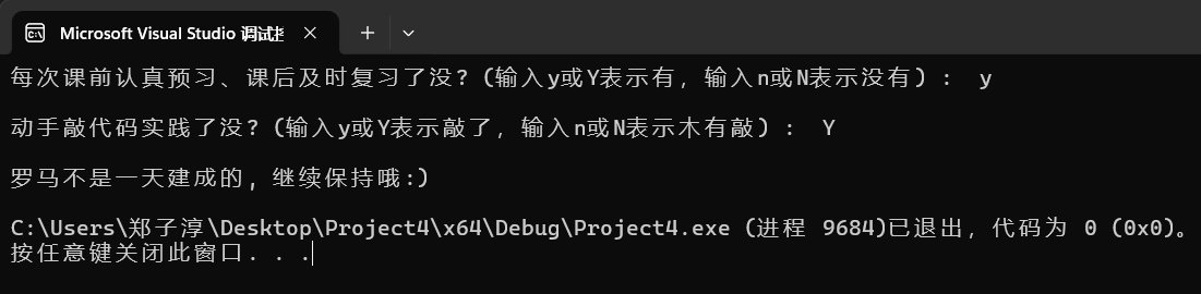 printf("\n罗马不是一天建成的, 继续保持哦:)\n");