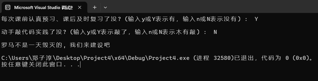 printf("每次课前认真预习、课后及时复习了没? (输入y或Y表示有,输入n或N表示没有) : ");