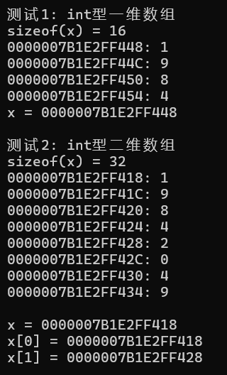 // 输出二维数组名x, 以及,x[0], x[1]的值