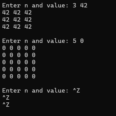 while (printf("Enter n and value: "), scanf("%d%d", &n, &value) != EOF) {