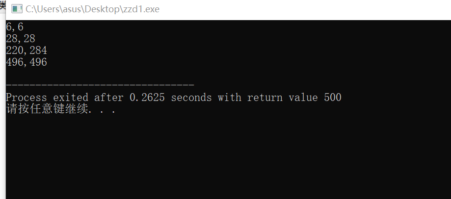 若正整数 A 的所有因子( 包括 1 但不包括自身,下同)之和为 B ,而 B 的因子之和为 A,则称 A 和 B 为一对亲密数。例如,6的因子之和为1+2+3=6,因此6与6为一对亲密数。求出500以内的所有亲密数对。
