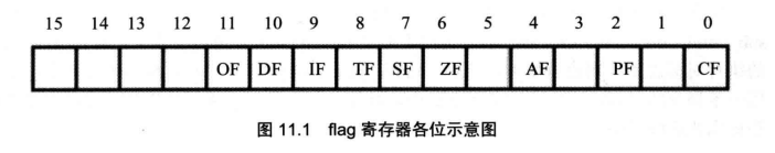 第6位ZF:零标志位,记录相关指令执行后,结果是否为0.结果为0,zf为1。 第2位PF:奇偶标志位。记录相关指令执行后,结果的所有bit中,1的个数是否为偶数。 第7位:SF,符号标志位,记录相关指令执行后,结果是否为负。 第0位:CF,进位标志位,在进行无符号数运算的时候,记录了运算结果的最高有效位向更高有效位的进位,或从更高位的借位。 OF,在进行有符号运算的时候,如果超过机器所能表示范围称为溢出。 DF,方向标志位,在串处理指令中,控制m每次操作后si和di的增减。df等于0,每次操作后si和di递增。df等于1,每次操作后si和di递减。