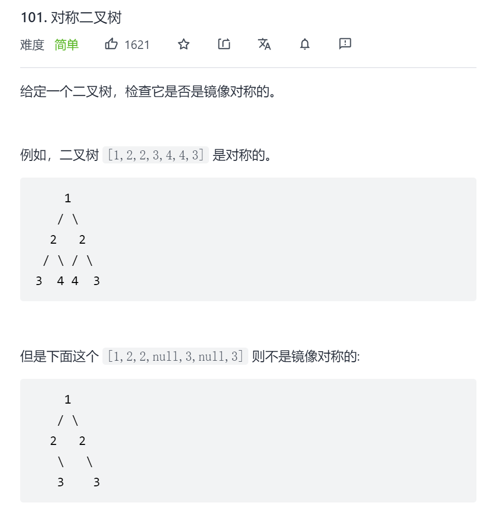 5.接下来递归判断左子树的左是否等于右子树的右,左子树的右是否等于右子树的左。(从题目给的样图可观察出这个条件)。