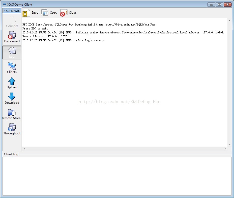 例子主要包括SocketAsyncEventArgs通讯封装、服务端实现日志查看、SCOKET列表、上传、下载、远程文件流、吞吐量协议,用于测试SocketAsyncEventArgs的性能和压力,最大连接数支持65535个长连接,最高命令交互速度达到250MB/S(使用的是127.0.0.1的方式,相当于千兆网卡1Gb=125MB/S两倍的吞吐量)。服务端用C#编写,并使用log4net作为日志模块;客户端使用DELPHI编写,和以前的DELPHI版完成端口共用一个客户端,提供C#版的上传客户端。