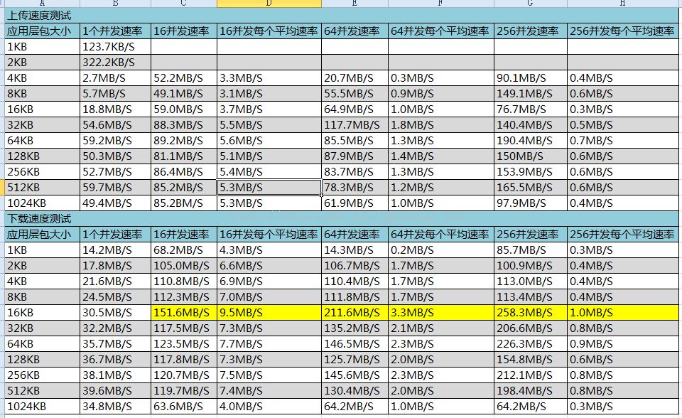 按文件上传下载对服务器进行应用层速率测试,分为1、16、64、256个并发进行测试,发包大小分1、2、4、8、16、32、64、128、256、512、1024KB,测试结果汇总如下,其中最高速率达到250MB/S,综合最优发包大小为16、32KB,其中速率计算有可能存在偏差,因为传到最后,并发数会变小,造成整个的速率上升,可以作为性能测试的参考。