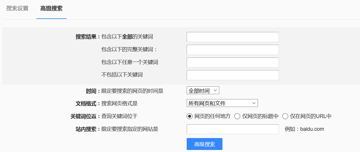 - 高级搜索界面,高级搜索界面的入口在搜索引擎首页右上角“设置”->“高级搜索”。