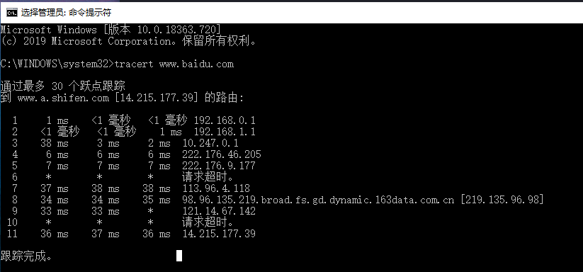 - 从左到右的5条信息分别代表了“生存时间”(每途经一个路由器结点自增1)、“三次发送的ICMP包返回时间”(共计3个,单位为毫秒ms)和“途经路由器的IP地址”(如果有主机名,还会包含主机名)。其中带有星号(*)的信息表示该次ICMP包返回时间超时。