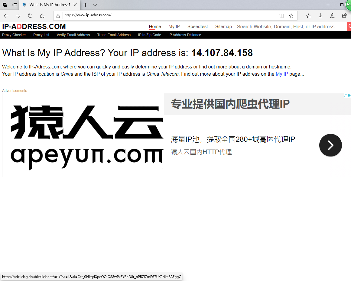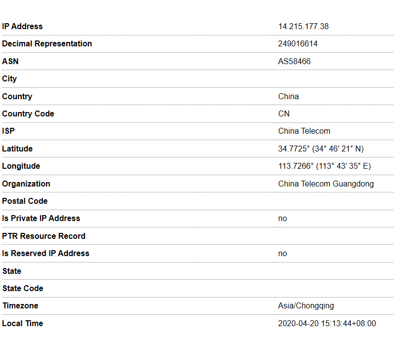 方法:网页初始界面会显示自己本机的 IP 地址,在左上角的框框里可以输入想要查询的IP,如 14.215.177.38 为百度的 IP ,14.107.84.158 为本机的 IP