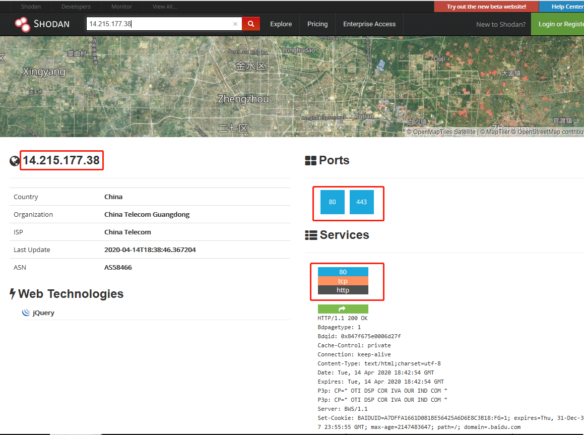 - 方法:打开网站,输入 IP 地址,可以看到地理位置,端口号和提供的服务具体信息